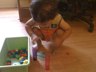 This is the only "stage" we got to in our tot activities. Then he proceeded to take the whole crate and throw the pieces all over the room. That was soooo much fun picking up! He may still be too small. It was fun though!